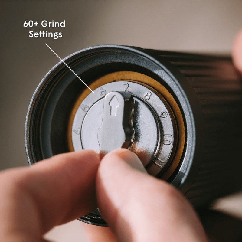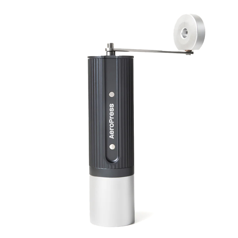 The AeroPress Manual Coffee Grinder is the compact high-performance manual grinder that lets you unleash barista-quality brews anywhere. Slim, durable all-metal build the AeroPress Manual Coffee Grinder packs Italian-made titanium-coated burrs, 60+ precise grind settings from espresso-fine to coarse, and an effortless long-crank handle with ball bearings for smooth power. Fits fully inside your AeroPress (handle and all) for ultimate portability.